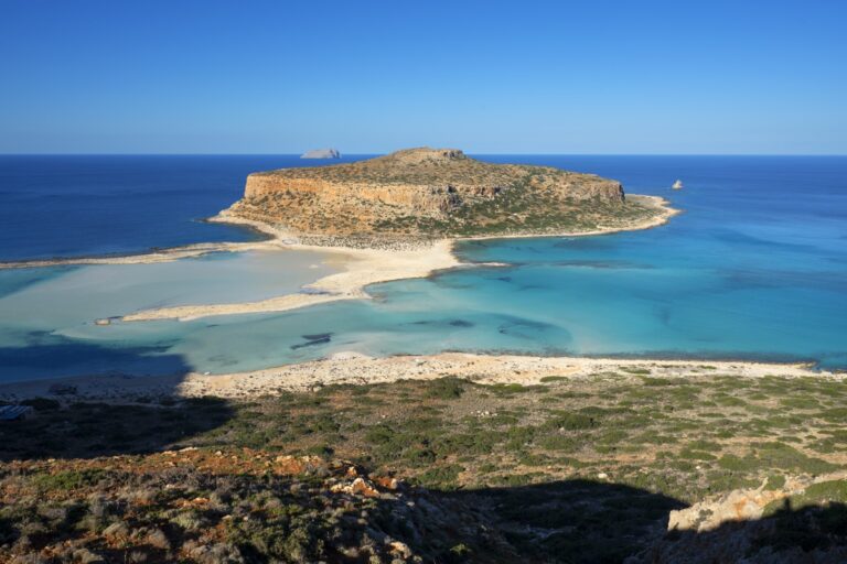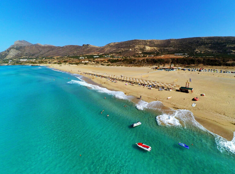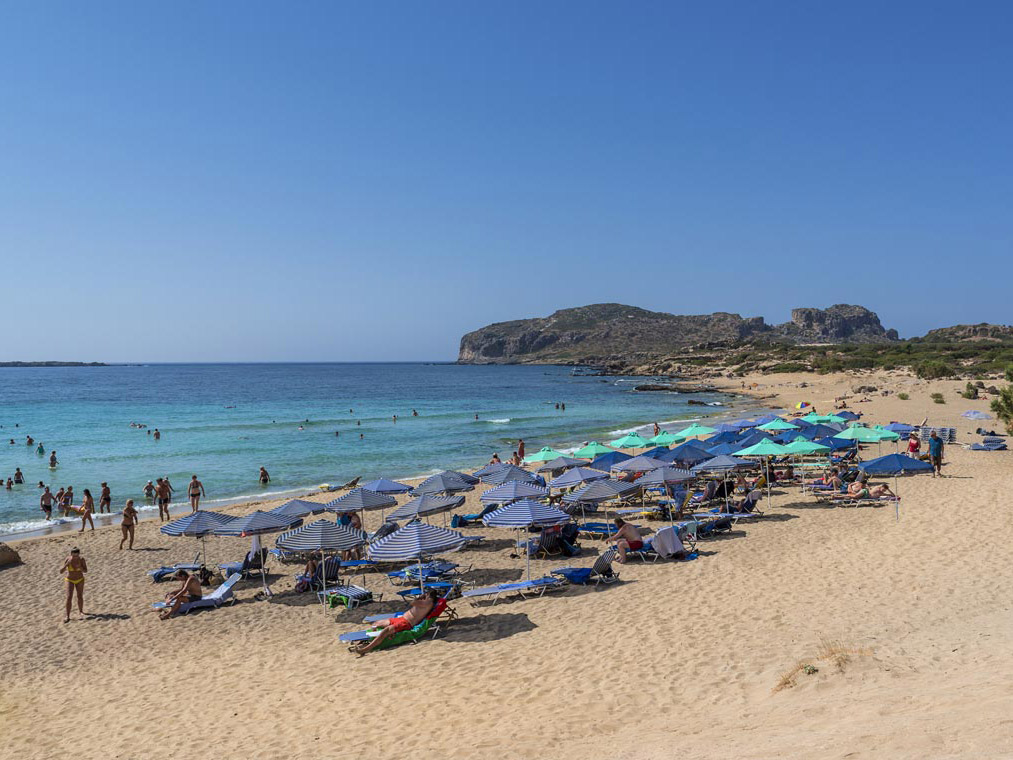 Falasarna bay is one of the most famous beaches in Greece, which has been awarded as the best beach of Crete and one of the 10 best beaches in Europe in the past. Falasarna spans a huge area and consists actually of five consecutive beaches, with the two most central being the most favorite. The sand in Falasarna is white, making the water color tropical. Indeed, if you’re lucky and be here on a day that is not blowing from the west, rare in west Crete, you will be enchanted by the beach and its turquoise waters. The main beach of Falasarna is called Pacheia Ammos (i.e Coarse Sand). It is an exotic beach with a length of 1km and a width of 150m. This beach hosts the most visitors of the area, but because of its length it never seems crowded. Also on the beach you will find Beach Volley and tennis courts and water sports facilities.